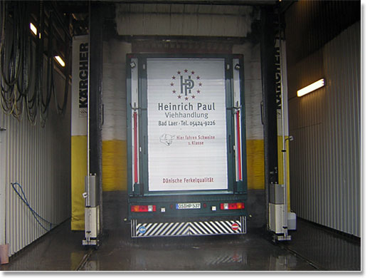 Bevor der Exportwagen auf der Umladestelle eintrifft, wird er an der Grenze zu Dänemark unter Kontrolle gewaschen und desinfiziert.